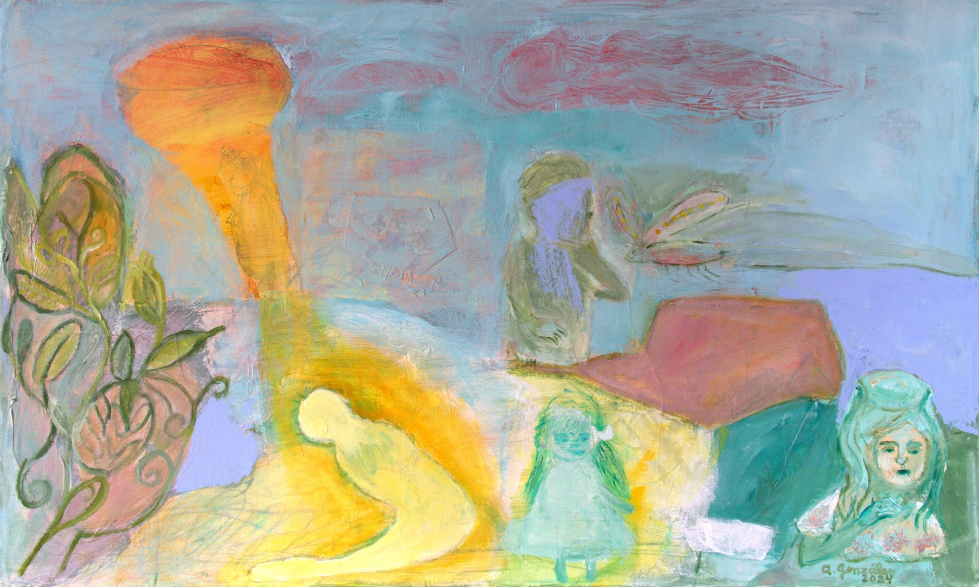 Abstract Original Painting canvas 40x24" Large wall Art girls dog trees turquoise green yellow AnaGonzalezArt