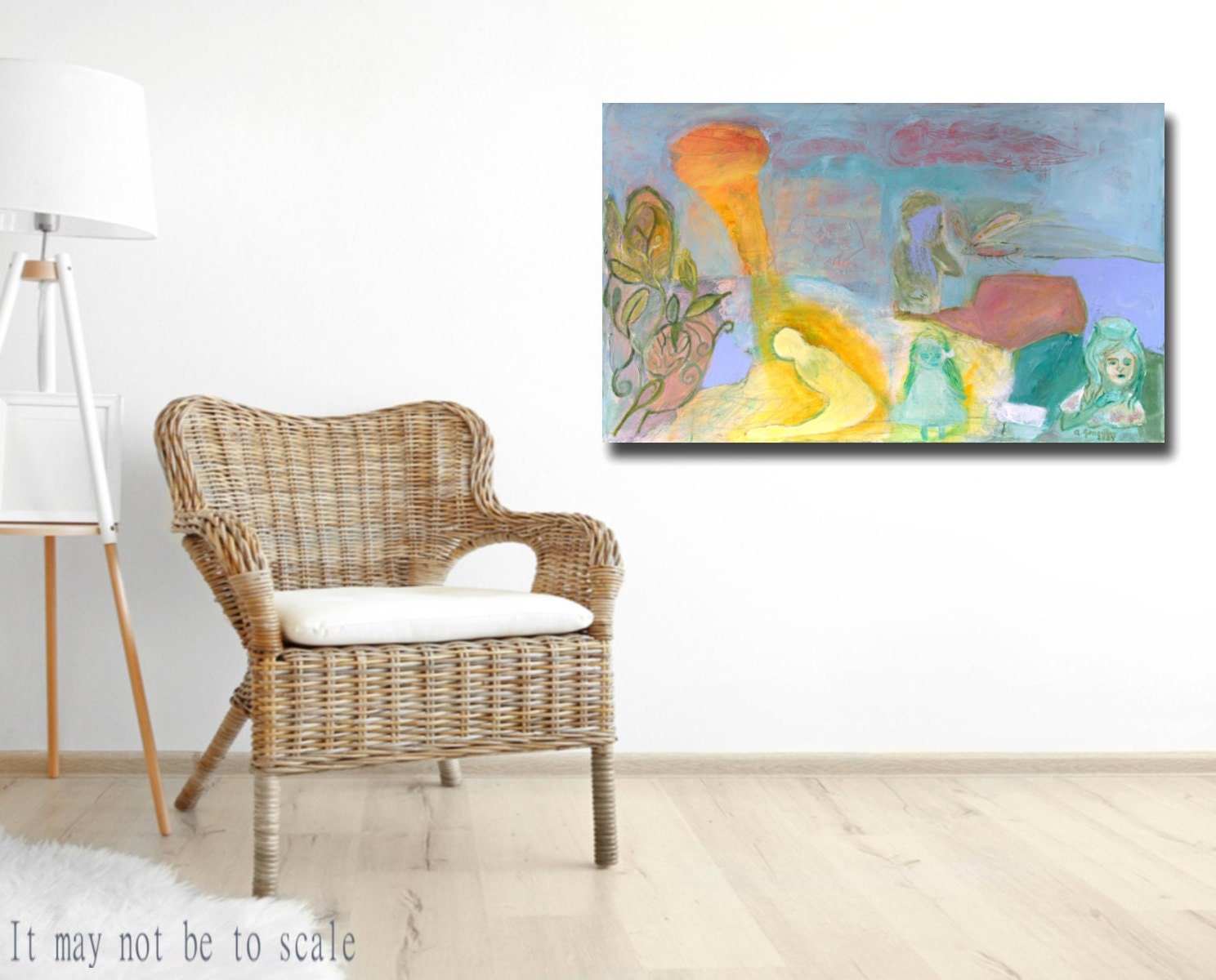 Abstract Original Painting canvas 40x24" Large wall Art girls trees turquoise green yellow AnaGonzalezArt