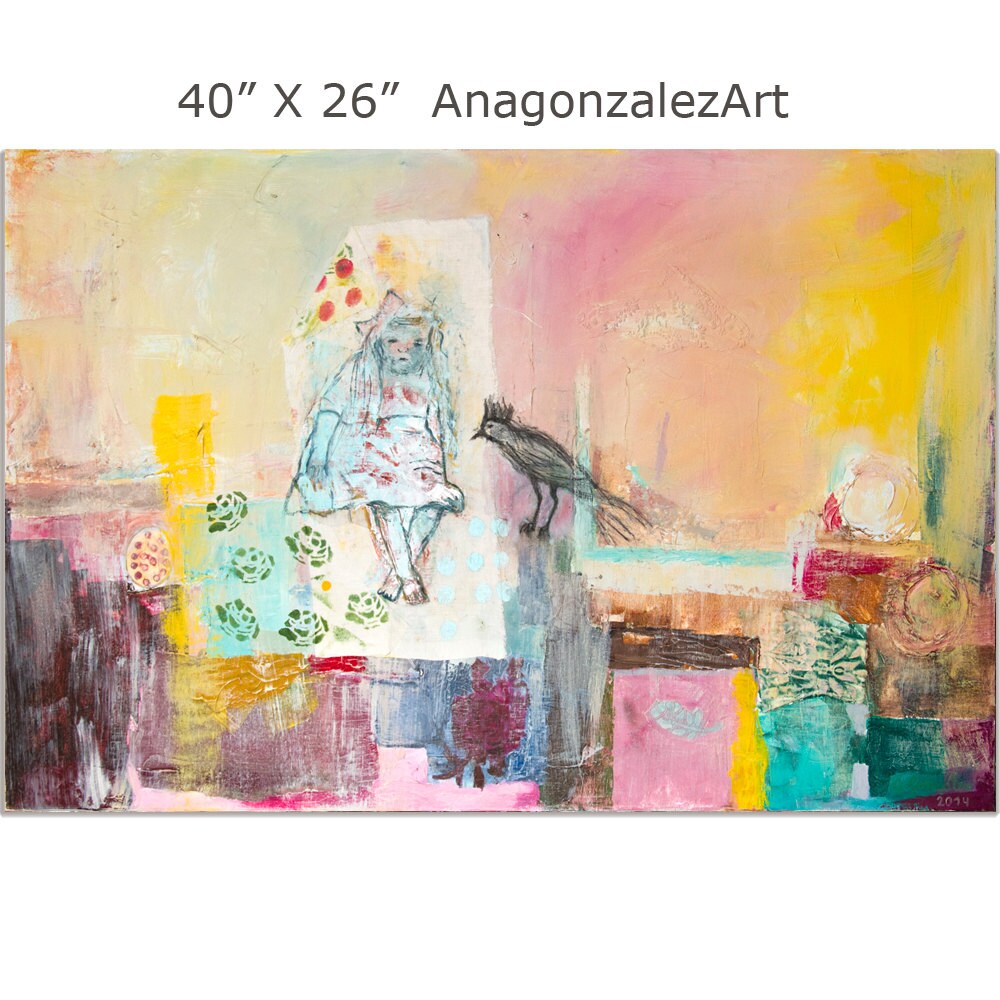 Abstract Painting canvas 40x26 Large wall Art mixed media turquoise green yellow pink Spanish Art