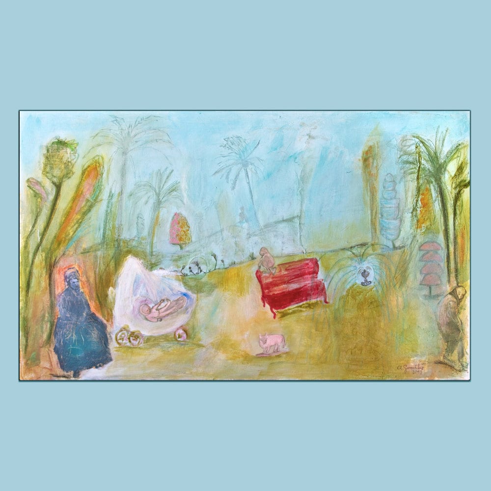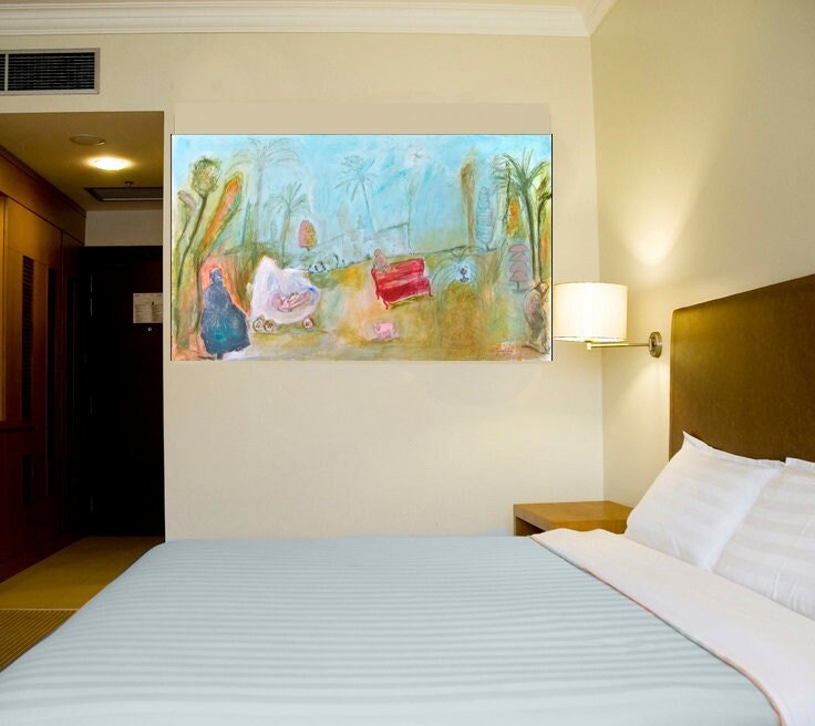 Original abstract Painting large landscape canvas 40x24 mixed media expressionist girl, baby turquoise ocher green cobalt red pink Modern wall Art. Spanish Art