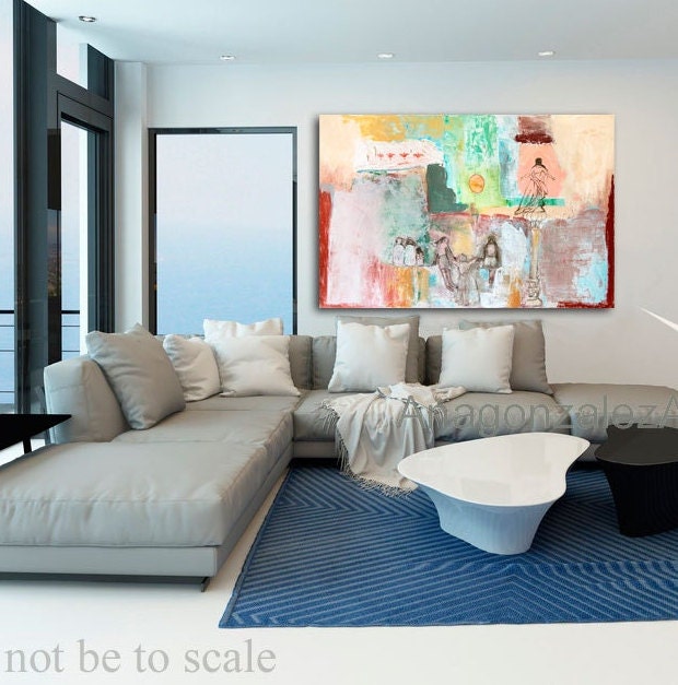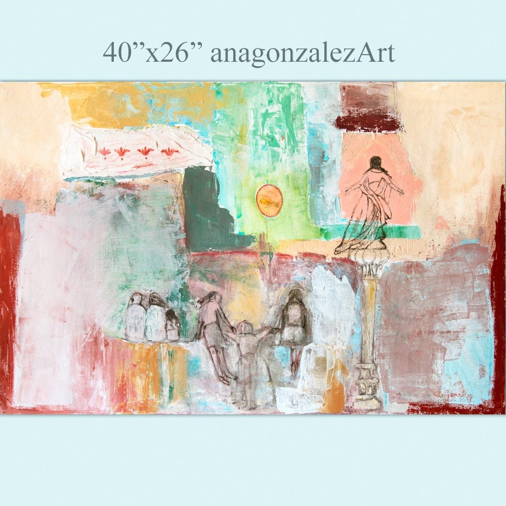 This Large Abstract Painting on 40"x26" canvas is ideal for wall art of modern home, their colors are yellow, green, pink, cream. Spanish Art. This Painting is painted with mixed media, has a piece of fabric and paper attached. Spanish Art