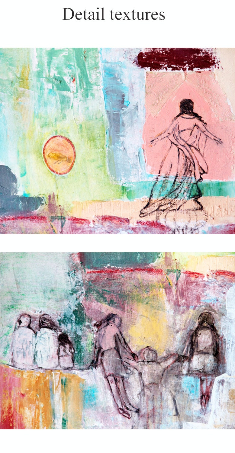 Lovely expressionist painting. A look mix of new and old. Her delicate colors and characters that compose it, make this painting perfect for that special corner of your home