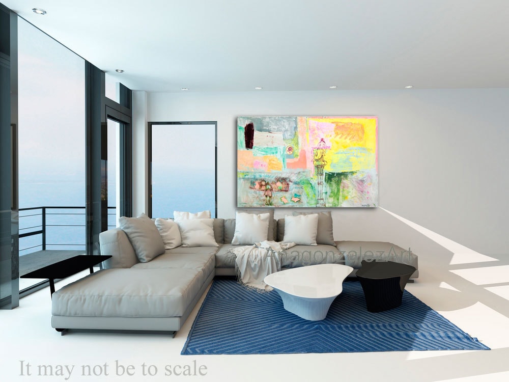 This Large Abstract Painting on 40"x26" canvas is ideal for wall art of modern home, their colors are yellow, green, pink, cream. Spanish Art. This Painting is painted with mixed media, has a piece of fabric and paper attached.