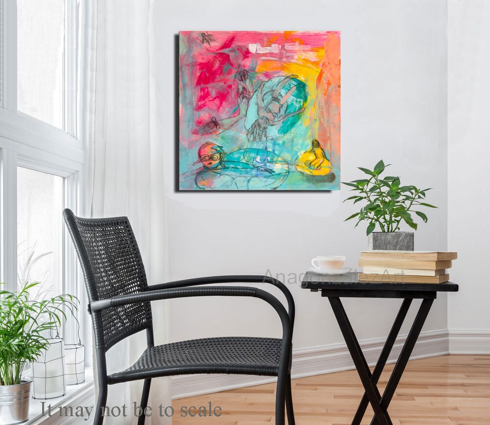 Original Painting 12x12 on cradled wood panel, abstract for decor home, green turquoise, pink, mixed media expressionist art