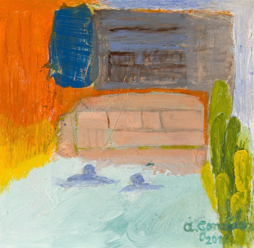 Original Painting 5"x 5" wood panel modern wall art orange bathers pool turquoise by AnaGonzalezArt