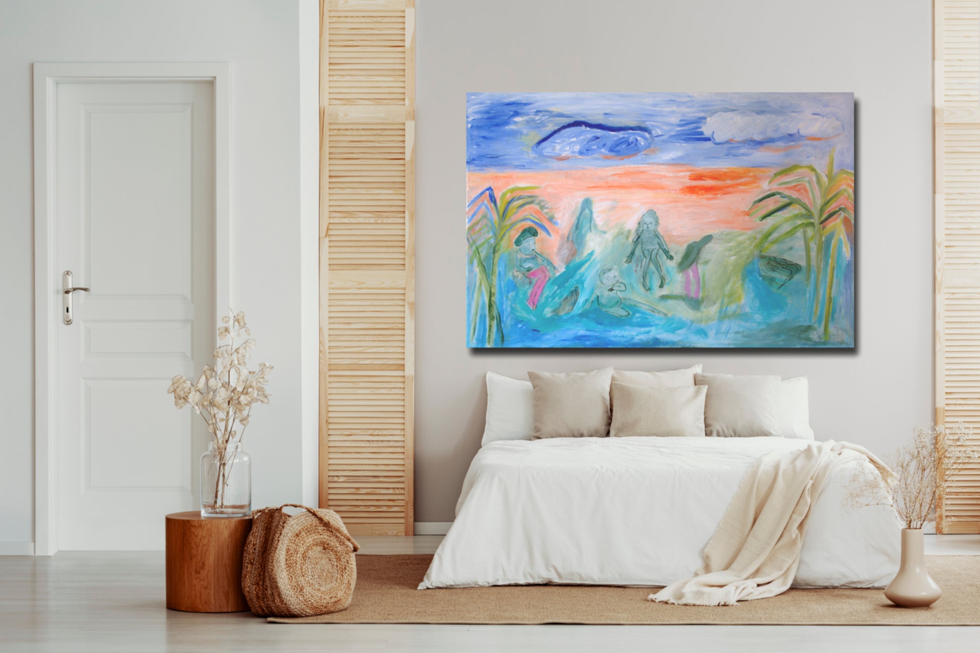 Original Painting canvas wall Art 40"x26" Large, landscape, sea, bathers, orange clouds, turquoise, green AnaGonzalezArt