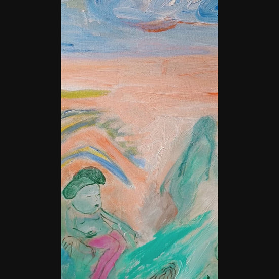 This Painting belongs to a series of 10 Paintings focused on nature and since we enjoy it, I needed the greenery of the forest, that peace and energy that it brings us, that is why I wanted to incorporate more landscapes, paint skies and clouds, with quick strokes, and trees and mountains and characters who are bathing or walking or playing. I have really enjoyed painting it and the characters and animals I invent always make me smile. If it conveys the same thing to you, you will love this Painting when you contemplate it daily in your home.